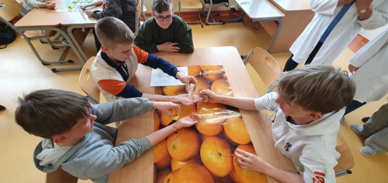 Z kolei zajęcia chemiczne miały charakter laboratoryjny. Podczas spotkania uczniowie samodzielnie wykonali proste, ale efektowne doświadczenia: wieżę gęstości, chemicznego kameleona, znikający atrament oraz sztuczną krew.