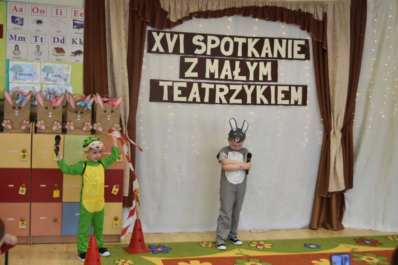 Nasze przedszkole reprezentowali: Aleksander Głowacki i Paweł Wolanin, którzy popisując się świetną dykcją i zdolnościami aktorskimi brawurowo zinterpretowali utwór Ludwika Jerzego Kerna pt.: „Zając i żółw’’. Dzieci do występów przygotowała p. Magdalena Dudek.