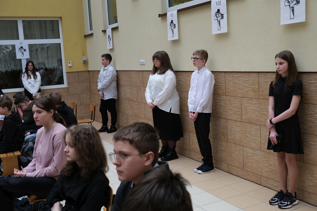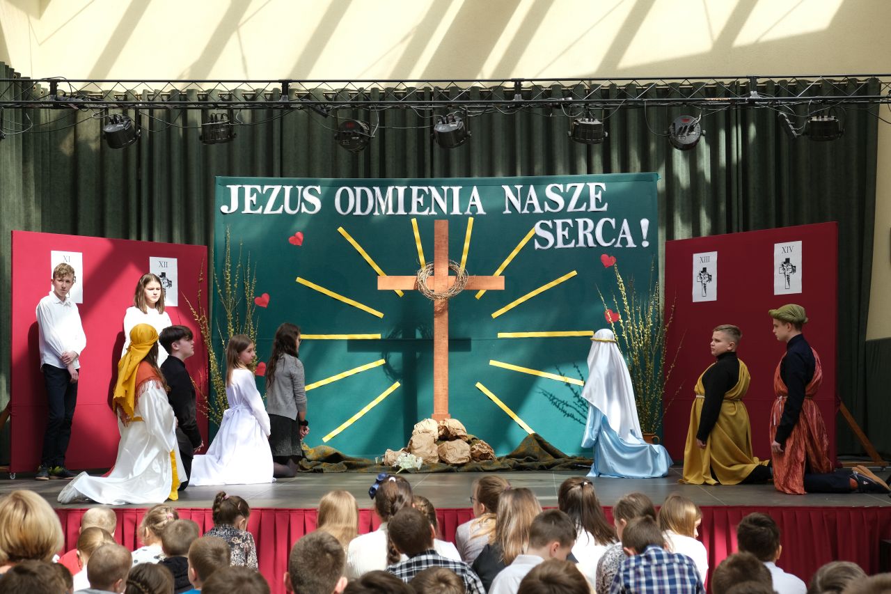 Uczniowie klasy IVa przedstawili różne sytuacje z codziennego życia szkolnego, które były przykładem złego postępowania. Jezus, którego zagrał Wiktor Gierlach, zaprosił dzieci do wzięcia udziałuw Drodze Krzyżowej. Chciał w ten sposób pokazać im, że Syn Boży musiał wiele wycierpieć, aby zobaczyli, jak Bóg kocha każdego człowieka. W wielkim skupieniu uczniowie klasy VI przedstawili poszczególne stacje Drogi Krzyżowej.