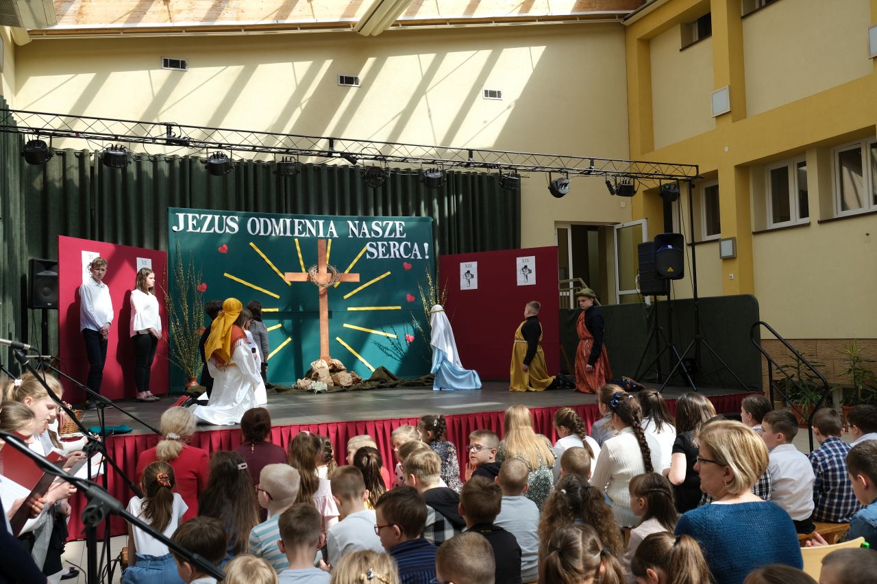 Przygotowując się do najradośniejszego i najwspanialszego wydarzenia, jakim jest zmartwychwstanie Jezusa, uczniowie klasy IVa i VI zaprosili społeczność szkolną na chwilę refleksji i zadumy przed najważniejszymi dla chrześcijan Świętami Wielkiej Nocy. Spotkanie pod hasłem „Jezus odmienia nasze serca!” odbyło się 5 kwietnia 2023 roku.