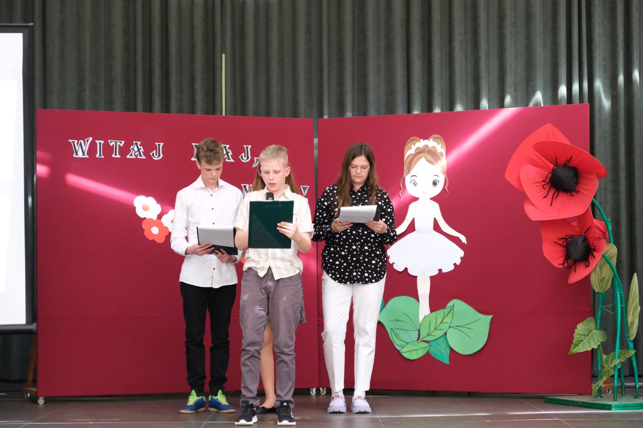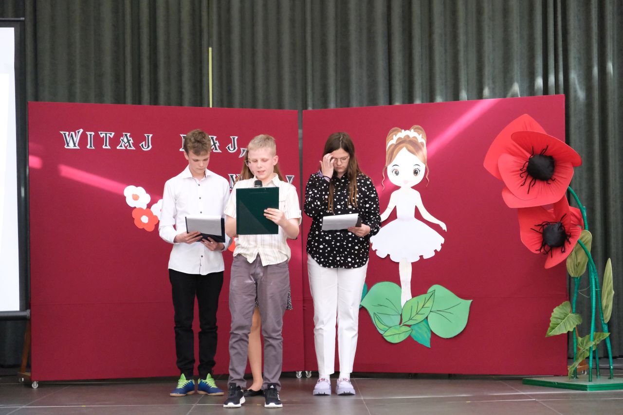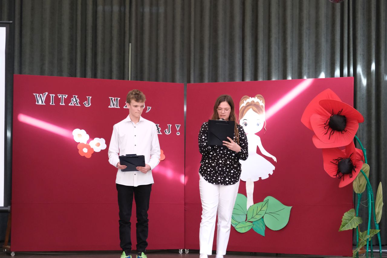 Te niezwykle ważne zagadnienia z historii Polski zostały zaprezentowane naszej społeczności szkolnej przez grupę uczniów z kl. VI. Maja Mazur i Wiktor Gierlach, jako narratorzy przedstawili rys historyczny tamtych wydarzeń. Natomiast Anna Sobota i Karol Gerlach wykonali piękne i wzruszające utwory literackie. Ponadto dwie uczennice Zuzanna Wojnarska i Anna Sobota zaśpiewały pieśni patriotyczne pt. ,,Witaj majowa jutrzenko” oraz ,,Jest takie miejsce, taki kraj”. Całą uroczystość ubogaciła prezentacja multimedialna przygotowana również przez uczennicę kl. VI Matyldę Rachwał. Nad całością uroczystości czuwała p. Małgorzata Ślączka.