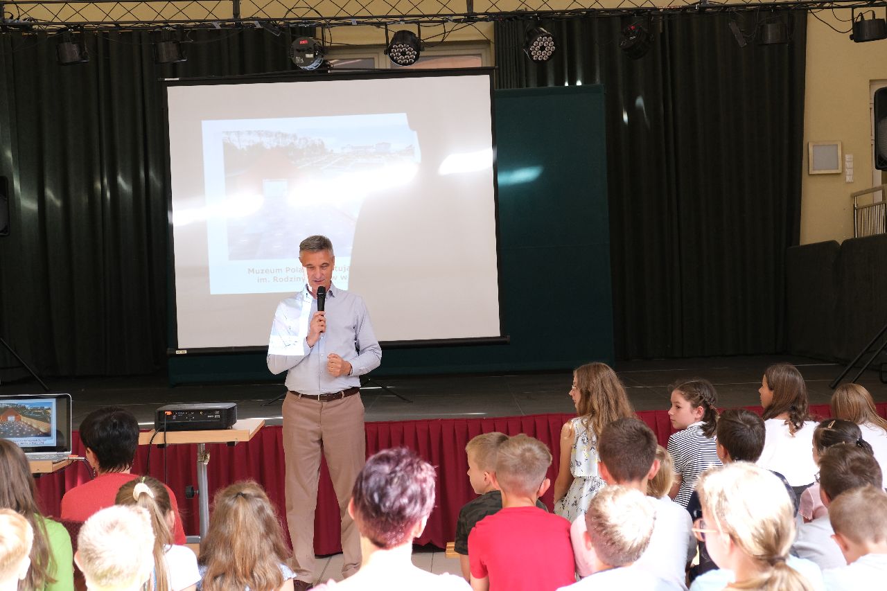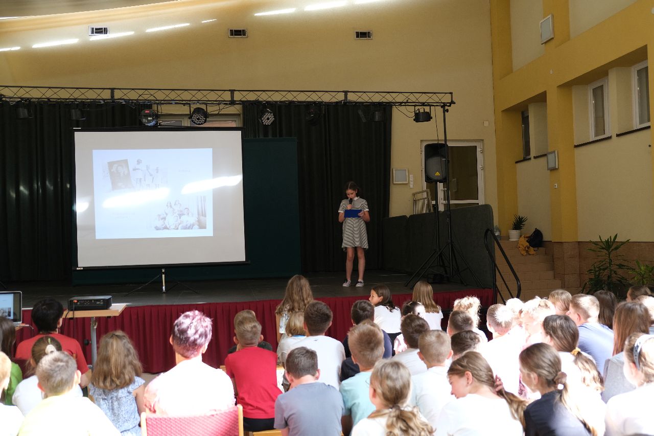 Ulmowie osiągnęli świętość na drodze cichego, prostego życia oraz wierności Ewangelii, która doprowadziła ich do męczeńskiej śmierci, oddając życie za bliźniego. Beatyfikacja tej rodziny to wydarzenie wyjątkowe, albowiem dotyczy całej rodziny, a także dziecka nienarodzonego. Z tej też okazji w naszej szkole 8 września 2023 r. miał miejsce krótki apel, przygotowujący nas do tych niecodziennych uroczystości. Zabrani na atrium pedagodzy i uczniowie mieli okazję obejrzeć reportaż o życiu i męczeństwie rodziny Ulmów oraz poznać pieśń do nowych błogosławionych, w której odkrywali oni tajemnice swojego pięknego życia. Prowadzącymi spotkanie były uczennice: Klara Zubel, Aleksandra Wania, Wiktoria Buczkowicz oraz Anna Sobota. Wszyscy uczestnicy spotkania w skupieniu słuchali i przyglądali się prezentowanym treściom.