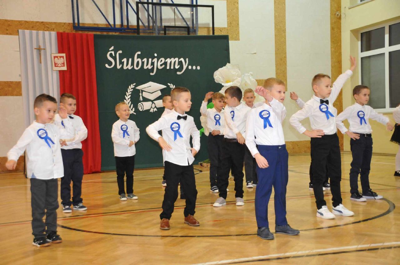 Pierwszaki przygotowywały się do tego wydarzenia pod czujnym okiem wychowawczyni, zdobywając nowe umiejętności i doświadczenia. Uroczystość miała bardzo podniosły charakter. Podczas części artystycznej pierwszoklasiści zaprezentowali swoje umiejętności recytatorskie, wokalne i taneczne. Wykazały się znajomością zasad obowiązujących w szkole, zapewniły, że sporo już umieją, pokazały, jak kochać naszą Ojczyznę, jak ją szanować.