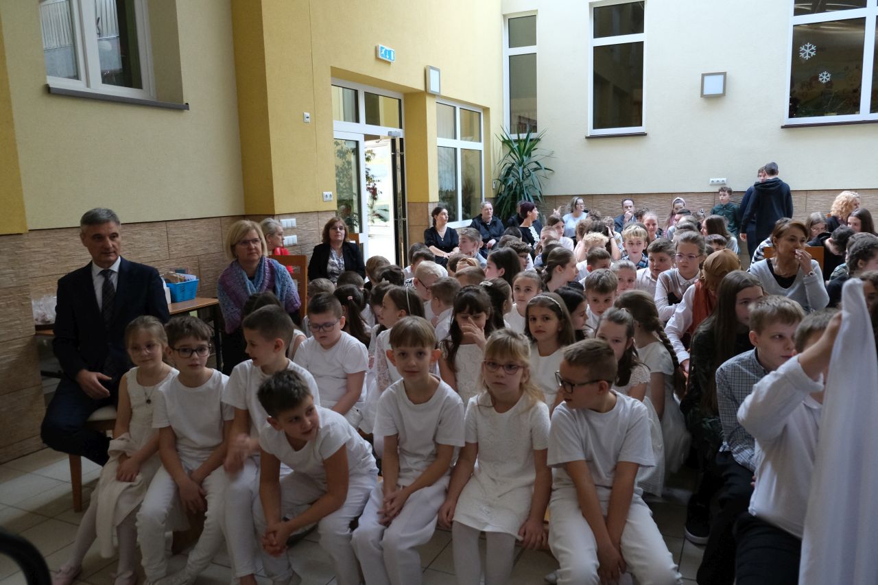 Na początku występów uczniów klasy 5a zaprezentowali pantomimę, która przeniosła widzów w czasie: do stworzenia świata, stworzenia człowieka, do wydarzenia grzechu pierworodnego i zapowiedzi zbawienia, które dokona się przy niezwykłym udziale Maryi, Matki Zbawiciela.