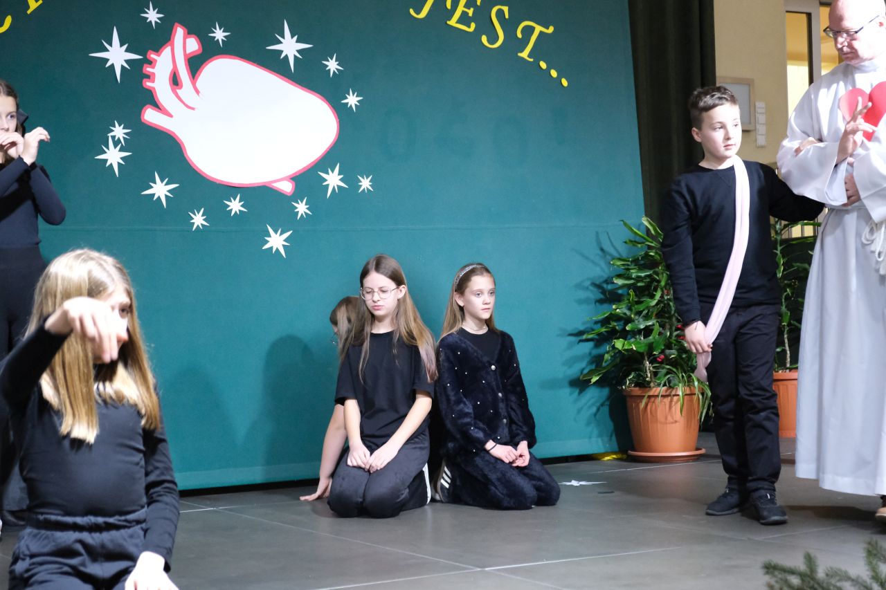 Narrację do całego przedstawienia prowadzili uczniowie klasy 7, pod okiem p. Dariusza Dudka i p. Anety Bąk. Młodzież, poprzez rymowaną opowieść, skłaniała słuchaczy do refleksji nad życiem, nad rodziną, nad obecnością Boga wśród nas. Wskazywali na wartości, jakie powinny w rodzinie kwitnąć, by była wspólnotą silną Bogiem i miłością. Uczniowie, w ramach występu, przygotowali także pokazowy stół wigilijny i to, co powinno się istotnego na nim znaleźć. Na zakończenie młodzież złożyła wszystkim życzenia, słowami wiersza ks. Twardowskiego.