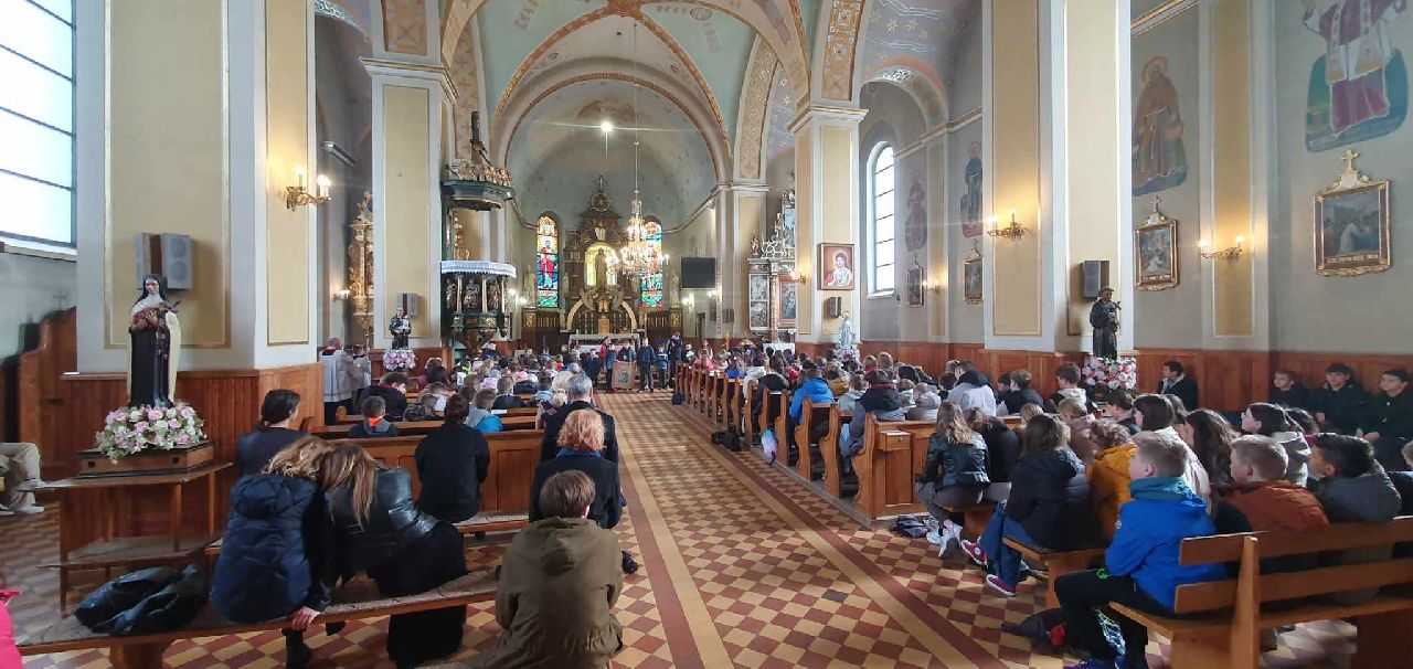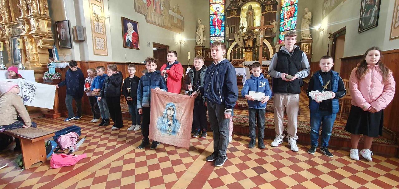 W ten sposób prowadzeni byliśmy do szczególnego momentu rekolekcji – osobistego oddania się Matce Bożej i zawierzenia Jej swojego życia. W kościele uczniowie podchodzili przed ołtarz i przy figurze Matki Bożej modlili się, składając w koszyku swoje listy i laurki dla Niepokalanej. Świadectwo swojej wiary składali także nauczyciele modląc się razem z dziećmi oraz przyjmując wraz z nimi medalik Niepokalanej. Ten niezwykły czas otoczony był nie tylko pięknym śpiewem, ale i modlitwą naszego księdza Pawła za nas wszystkich i nasze rodziny. Puntem centralnym rekolekcji była uroczysta Eucharystia, w której wielbiliśmy dobrego Boga za ten cenny czas prosząc, by wydał piękne owoce miłości Boga, Maryi i bliźniego w naszym życiu.