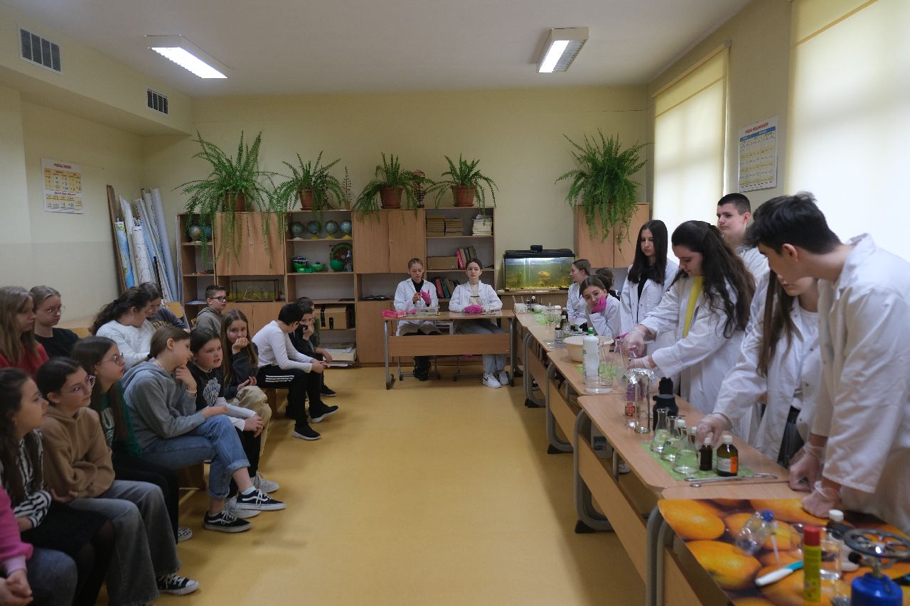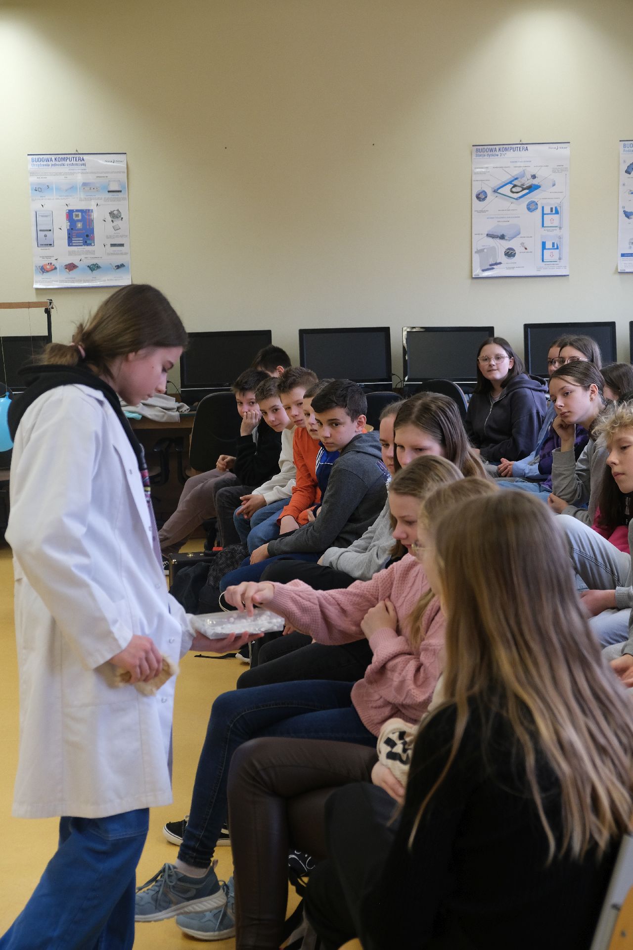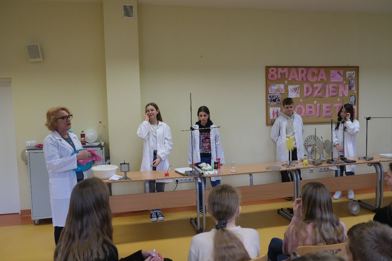 Młodzież tłumaczyła zachodzące zjawiska wciągając odbiorców, którymi byli młodsi koledzy z klas 5 i 6, w tajemniczy świat chemii i fizyki.