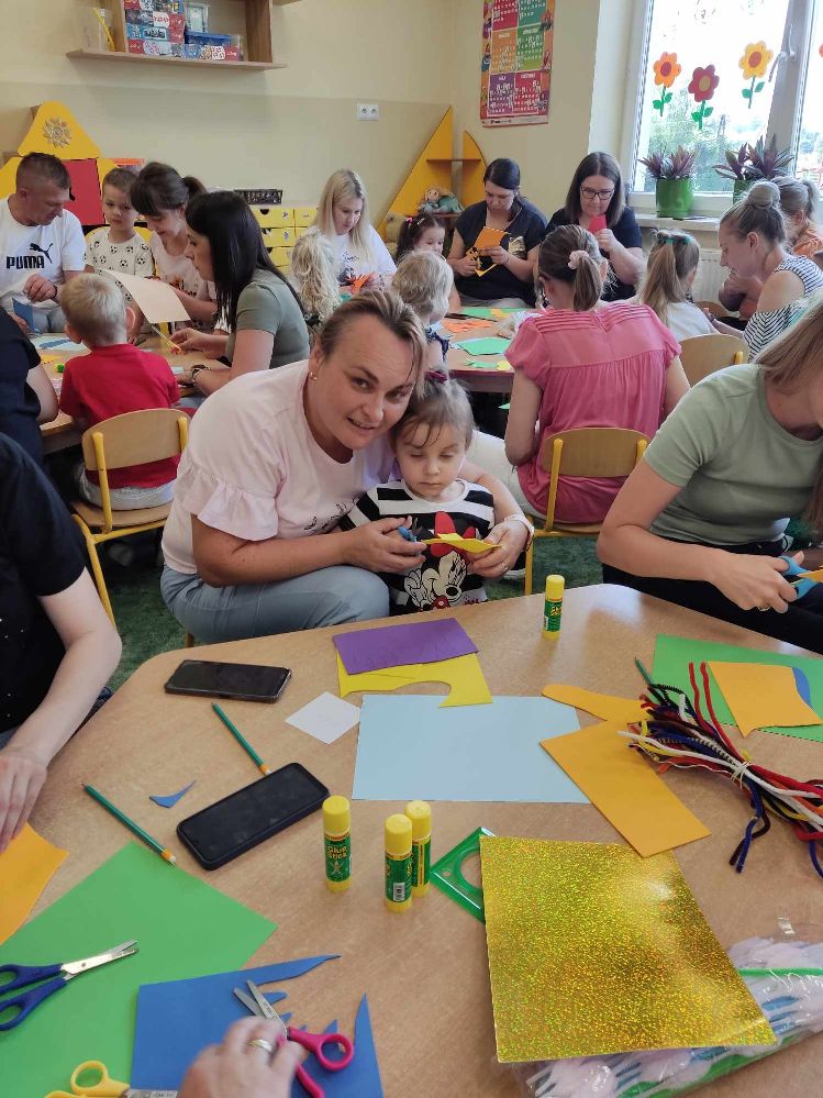 Ostatnim etapem zajęć była praca przy stolikach. Rodzice czynnie uczestniczyli w zajęciach. Każde dziecko wraz z rodzicem wykonało motylka, wykazując się własną inwencją i pomysłem. Jedyną wskazówką daną przez nauczyciela było wykorzystanie odrysowanej stópki dziecka do zrobienia odwłoku motyla oraz obrysu dłoni dziecka jako skrzydeł. Efekt tej pracy przyniósł dzieciom i ich rodzicom wiele radości. Każde dziecko wraz z rodzicem powiesiło swoją pracę na tablicy.