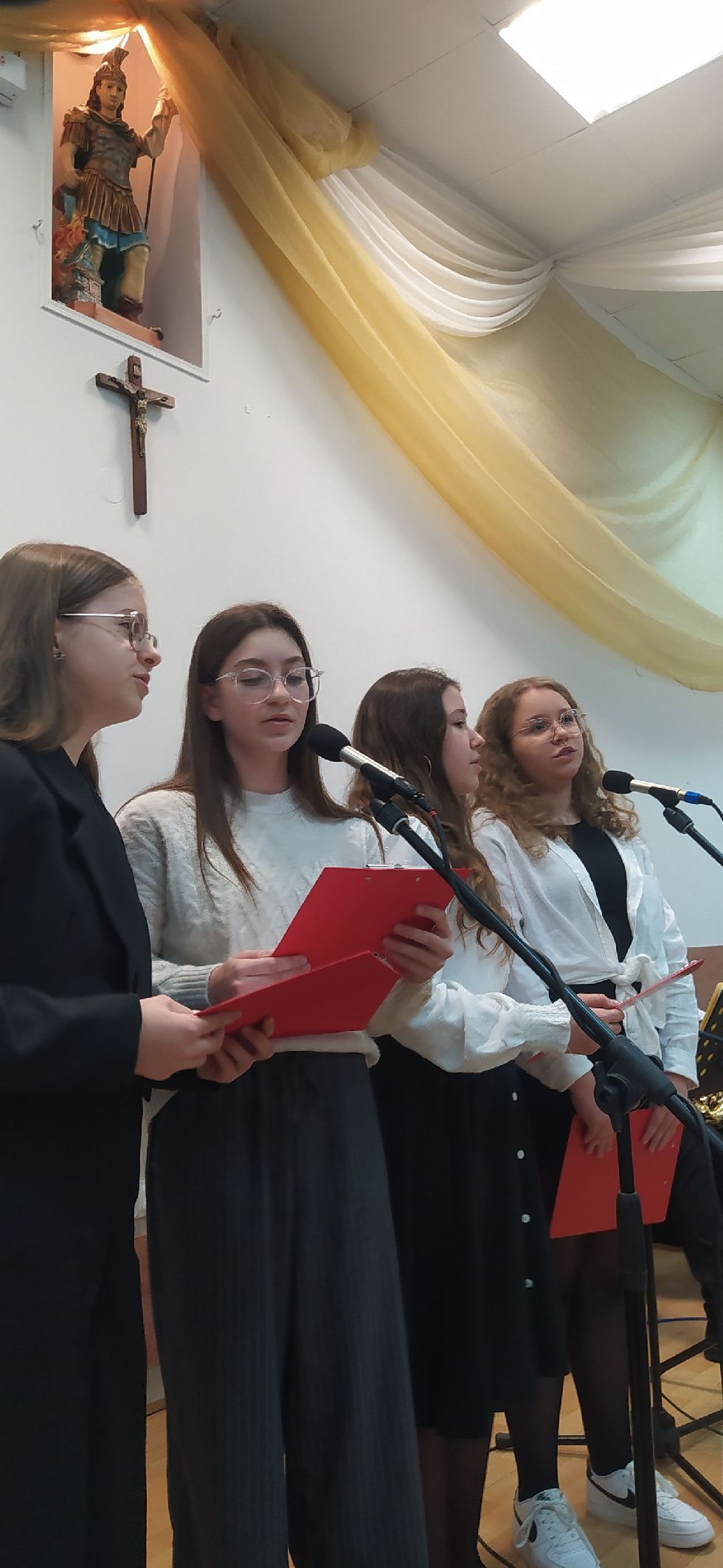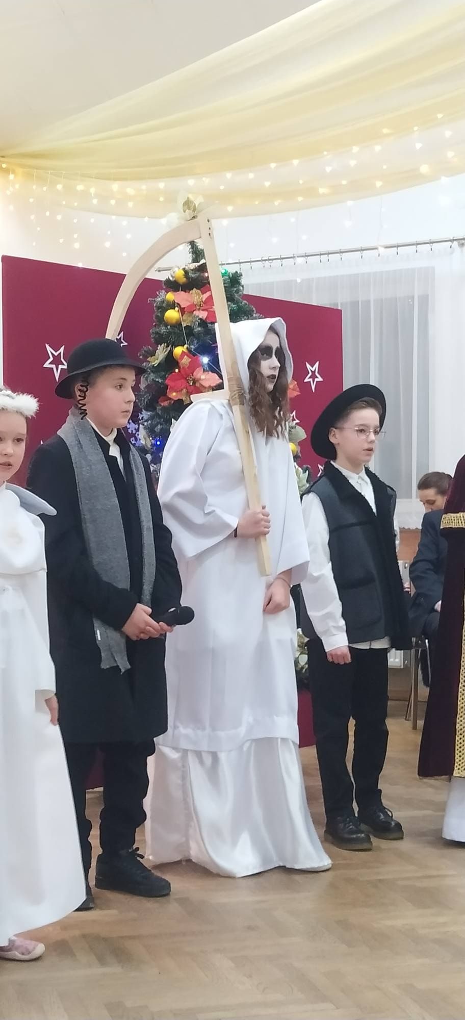 Na scenie można było zobaczyć diabełki, aniołki, Józefa i Maryję z maleńką Dzieciną, pastuszków, Heroda i przerażającą śmierć. Kolędnikom towarzyszyła gwiazda, która była symbolem światła i zwycięstwa dobra nad złem. Uczniowie klasy III a zaprezentowali również tradycyjny taniec krakowiak.